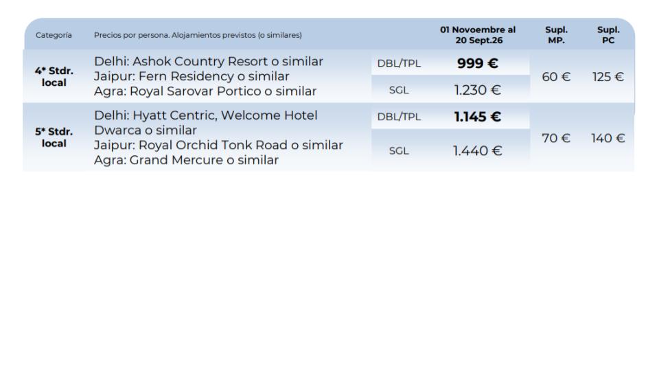 Pensión completa opcional. Durante la estancia en Delhi, visita en tour privado del Viejo Delhi. El recorrido incluye la visita de Jama Masjid, con su inmenso patio y cúpulas de mármol. Recorrido por la zona del Fuerte Rojo y ChandniChowk, formado por un laberinto de callejones. Visita también de la Nueva Delhi, parte moderna de la ciudad construida por los ingleses en el año 1911 como sede administrativa del British Raj. El recorrido incluye la Puerta de la India; Qutub Minar, RashtrapatiBhawan, antigua Residencia del Virrey y hoy Palacio Presidencial, zona de las Embajadas y sus principales calles y avenidas. La visita concluirá con la visita del Templo Sij “BanglaSahib” y templo de Birla.